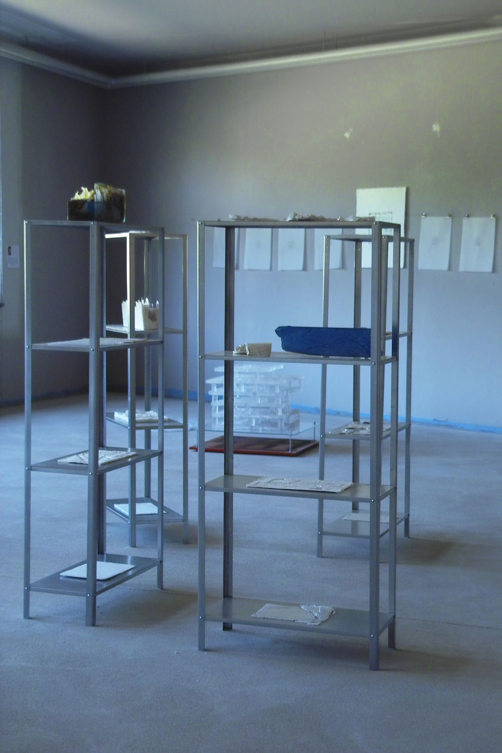 4 Metallregale + div. Arten Glas, Porzellan, Formmaterial und Papier.